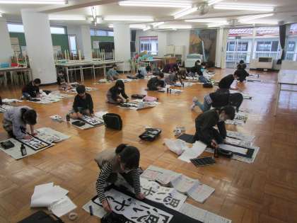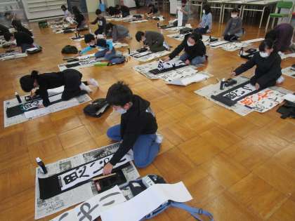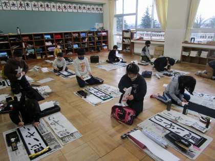 始業式後には、書き初め大会が行われました。初めての毛筆での書き初めでしたが、大変すばらしく、子供たちはこれまでの成果を出そうと、集中して取り組んでいました。