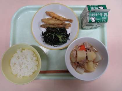 今日の献立は、ごはん、牛乳、わかさぎのフリッター、ひじきのごま和え、豚肉の南蛮煮でした。