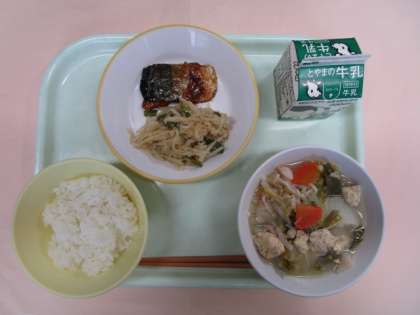 今日の献立は、ごはん、牛乳、サバの照焼、はりはりソテー、はくさい鍋でした。