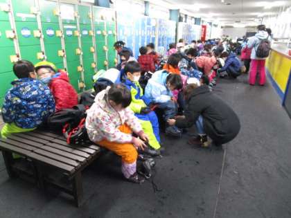 親進会の学級役員の方方6名に手伝ってもらいスケート靴をはき、あしy