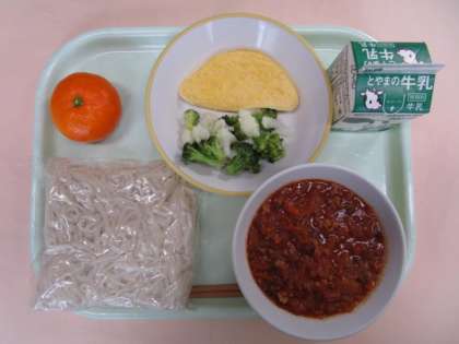 今日の献立は、ソフト麺、牛乳、オムレツ、花野菜サラダ、ミートソース、みかんでした。