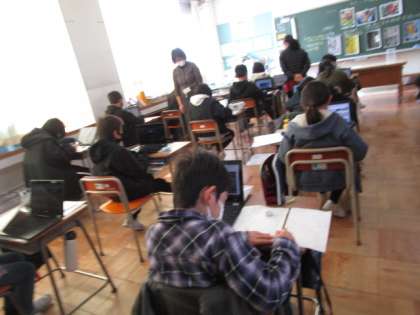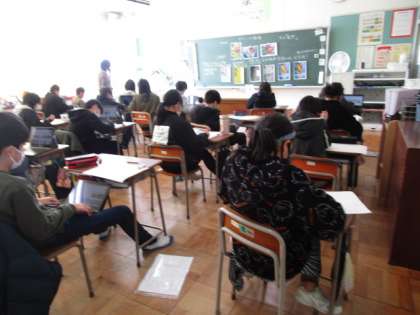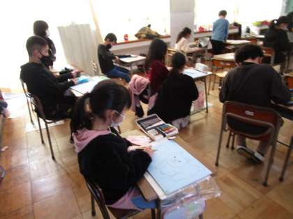 図画工作科では、彫刻刀で版画の作品を制作したり、画像を基に下絵を考えたりしています。