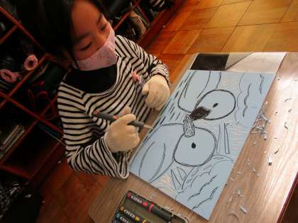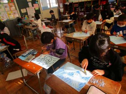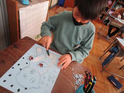 図工では、生き物をテーマに制作を進めています。初めて彫刻刀を使う3年生。苦戦しながらも、きれいに彫れると「わあ!」と笑顔が見られます。少しずつ丁寧に彫り進めています。完成が楽しみです。