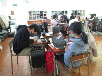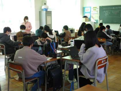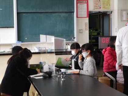 感染対策を講じながらグループ活動を行っています。理科室でパーテーションを使ってグループで実験をしたり、教室で距離を取りクロームブックを活用してグループで話合ったりしています。