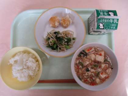 今日の献立は、ごはん、にんじんシューマイ、おひたし、マーボー豆腐でした。