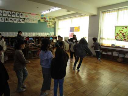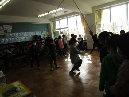 今日の「すこやか運動」は、たてわり班ではなく、各教室で大なわの8の字跳びを行いました。