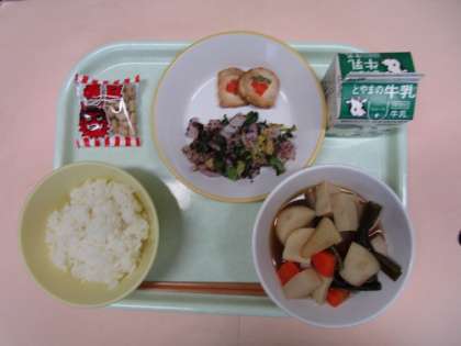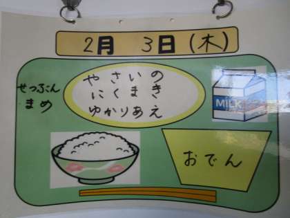 今日の献立は、ごはん、牛乳、野菜の肉巻き、ゆかり和え、おでん、せつぶん豆です。