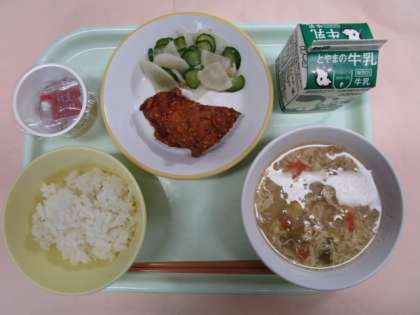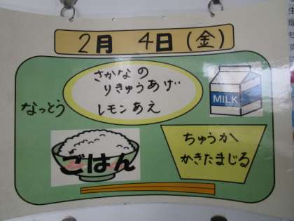 今日の献立は、ごはん、牛乳、魚の利休揚げ、レモン和え、中華かきたま汁、納豆でした。
