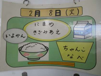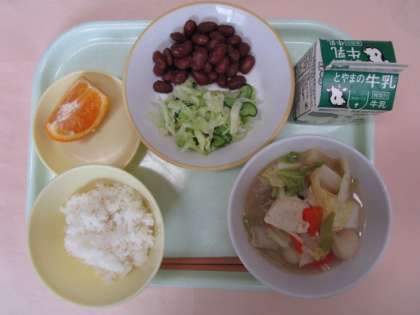 今日の献立は、ごはん、牛乳、煮豆、きざみ和え、ちゃんこ鍋、いよかんでした。