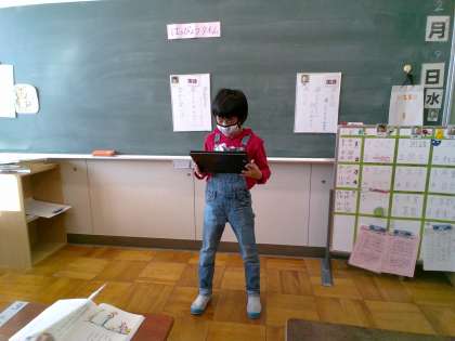 1組では、久しぶりに3人がそろっての学習だったので、「発表タイム」をしました。1年生は、今学習している「どうぶつの赤ちゃん」の音読を発表。2年生は、今年縄跳びをがんばったことについてカードに書いたメモを基にクロムブックのドキュメントでまとめた作文を発表。6年生は外国語の学習でまとめている「小学校の思い出」を発表しました。