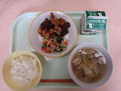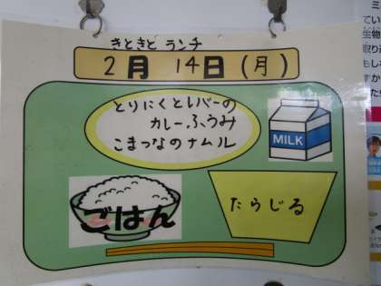 今日の献立は、「きときとランチ」でごはん、牛乳、鶏肉とレバーのカレー風味、小松菜のナムル、たら汁でした。