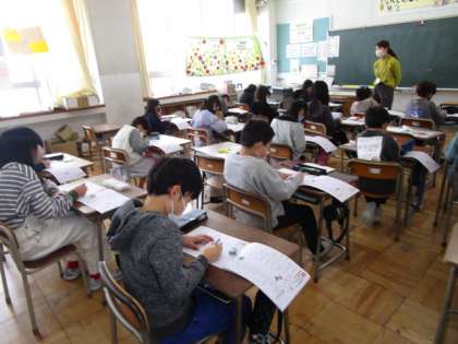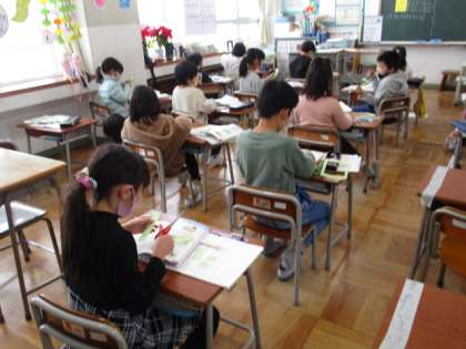 授業では、おりがみを切って重ねて図形を考えたり、ノートやワークに文字をていねいに書いたりして集中して取り組んでいます。