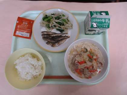 今日の献立は、ごはん、牛乳、白ごま豆乳うどん、小アジの唐揚げ、菜花ひたし、穀物ふりかけでした。