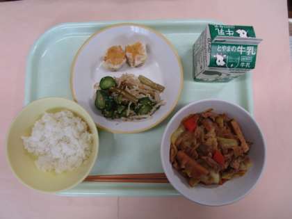 今日の献立は、ごはん、牛乳、にんじんシューマイ、茎わかめのごま酢和え、回鍋肉でした。