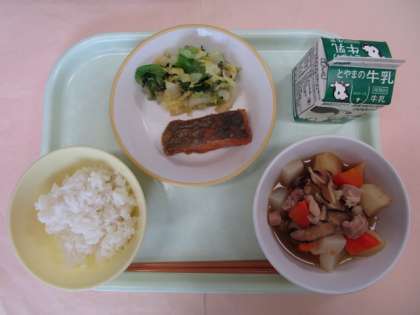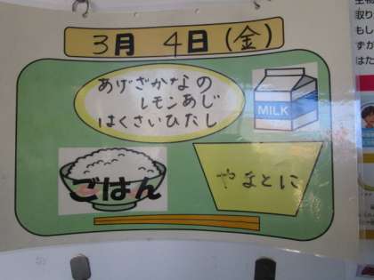 今日の献立は、ごはん、牛乳、揚げ魚のレモン味、はくさいひたし、大和煮でした。