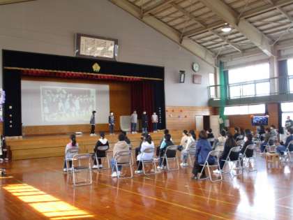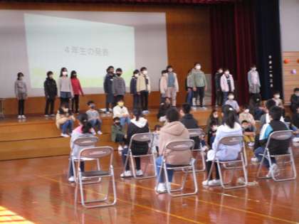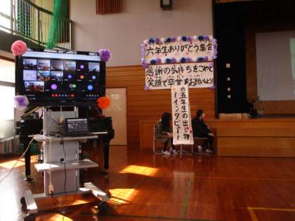 「6年生さんありがとう集会」では、4年生は「歌」、5年生は「クイズ、インタビュー」でした。6年生と運営している5年生、発表学年以外は、教室でオンライン参加しました。