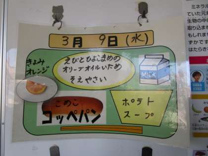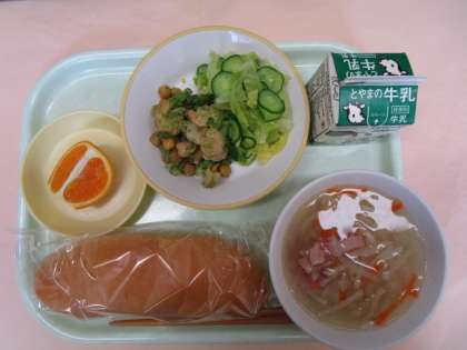 今日の献立は、米粉コッペパン、えびとひよこ豆のオリーブオイル炒め、添え野菜、ポテトスープ、清見オレンジでした。