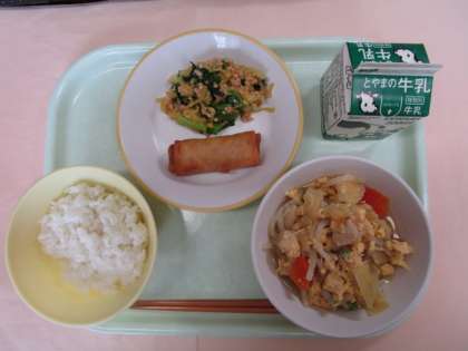 今日の献立は、ごはん、牛乳、春巻き、納豆和え、親子煮でした。