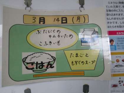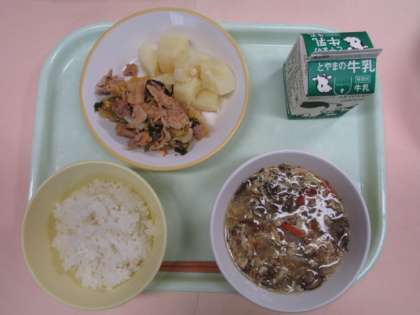 今日の献立は、ごはん、牛乳、豚肉のキムチ炒め、こふきいも、たまごともずくのスープでした。