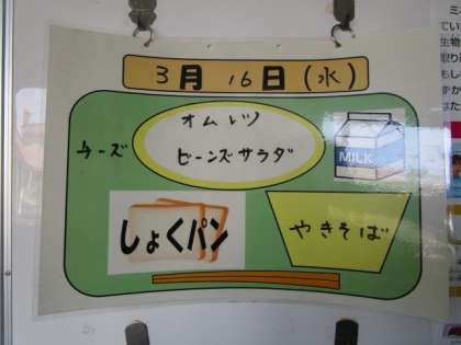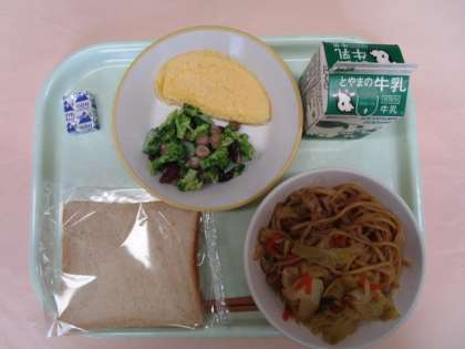 今日の献立は、食パン(減量)、牛乳、オムレツ、ビーンズサラダ、焼きそば、チーズでした。