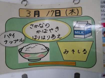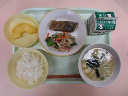 今日の献立は、ごはん、牛乳、魚のかば焼き、はりはり和え、みそ汁、パイナップルでした。