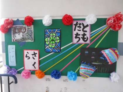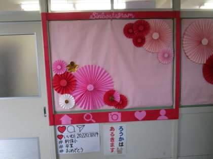 明日の卒業式に向けて、階段や廊下の掲示がさらにグレードアップしました。保健室前には、フォトスポットもできました。