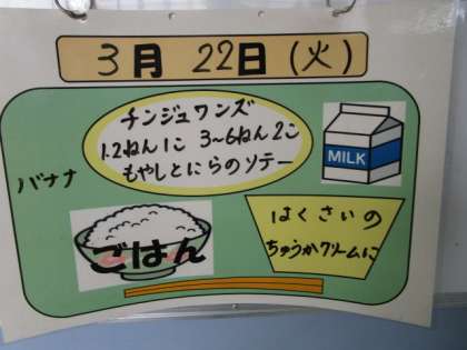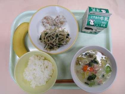 今日の献立は、ごはん、牛乳、チンジュワンズ、もやしとにらのソテー、白菜の中華クリーム煮、バナナでした。
