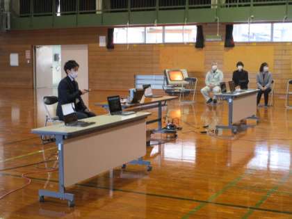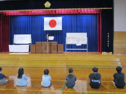 体育館では、各教室等へリモートでつなぐクロームブックが並びました。また、校長先生の話は、代表の子供と担任ではない教職員が参加しました。