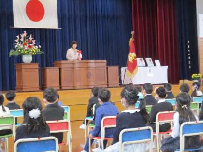 入学式では、一年生の子供たちが元気に入場し、名前を呼ばれた際にはしっかりとお辞儀をしていました。また、校長先生のお話や担任発表も、立派な姿勢で聞いていました。