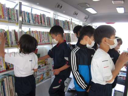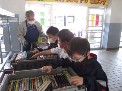 今日が自動車文庫の日であることを伝えると、大喜びしていた子供たち。今回はとても短い時間の利用になりましたが、自分の読みたい本を選び、じっくりと読んでいました。