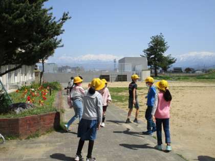 ここ数日、気温の高い日が続き、グラウンド横花壇のチューリップの花が一気に開きました。暑いほどの日差しの中、今日も元気に外遊びに興じる新保っ子です。