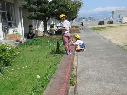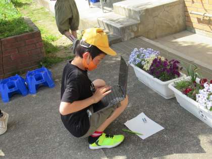 理科の学習では、あたたかくなると生き物や植物はどのような様子であるかについて、クロームブックを使って観察をしました。子供たちは、春の生き物や植物を探し、クロームブックで撮影して、それぞれの特徴を見つけていました。
