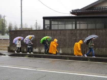 1年生はカッパでの登校2日目。雨の中、上級生が後ろを振り返りながら1年生の姿を確認(中には手をつないでくれる子も)し、安全に登校してきてくれました。