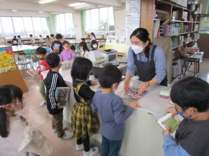 今日は、初めて「本の貸出」手続きにも挑戦しました。少しずつ学校生活のいろいろを経験し、覚えている1年生です。