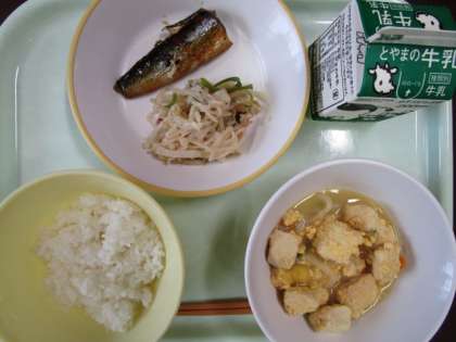 今日の献立は、ご飯、いわしの梅煮、はりはりソテー、厚揚げの錦とじ、牛乳 です。
