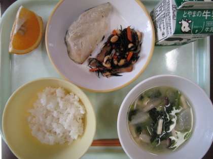 今日の献立は、ご飯、鰆の塩焼き、ひじきの炒め煮、高野豆腐のみそ汁、サンフルーツ です。