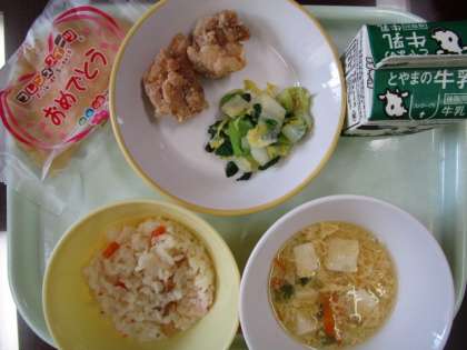 今日の献立は、入学と進級をお祝いする献立で、ちらし寿司、鶏肉のから揚げ、チンゲンサイひたし、かき玉汁、いちごクレープ、牛乳 です。