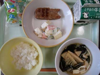 今日の献立は、ご飯、鯉のぼりハンバーグ、ポテトサラダ、若竹汁、かしわもち、牛乳 です。