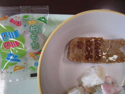 今日の献立は、ご飯、鯉のぼりハンバーグ、ポテトサラダ、若竹汁、かしわもち、牛乳 です。