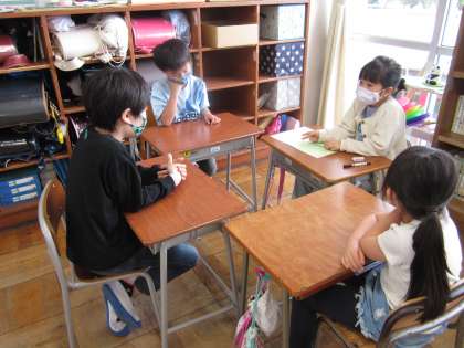 生活科の学習では、1年生が新保小学校とも2年生とも仲良くなれるように、「学校クイズ」を考えているところです。「校長先生の顔を当てるクイズはどうかな?」「図書室の本の冊数を問題にしたいな!」など、面白い問題がたくさん完成しそうです。