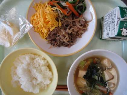 今日の献立は、ビビンバ丼(ご飯、焼き肉、ナムル、錦糸卵)、中華スープ、冷凍りんご、牛乳 です。