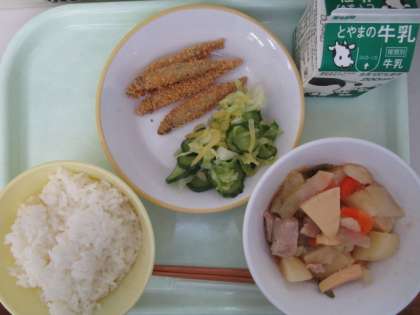 今日の献立は、ご飯、きびなごのサクサク揚げ、あわせ和え、鶏肉とじゃがいものうま煮、牛乳 です。