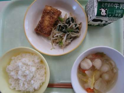 今日の献立は、ご飯、揚げ出し豆腐のごまだれかけ、昆布和え、つみれ汁、牛乳 です。