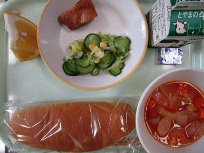 今日の献立は、コッペパン、照り焼きチキン、コールスローサラダ、ミネストローネ、ポケットチーズ、甘夏みかん、牛乳 です。