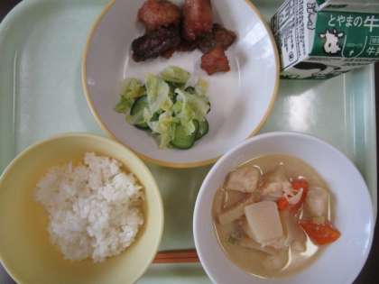 今日の献立は、ご飯、豚肉とレバーの揚げからめ、きざみ和え、ごまけんちん、牛乳 です。