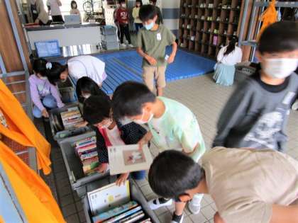 今日は「自動車文庫」があり、3冊選んで借りました。題名等を見ながら慎重に選ぶ子もいれば、「図鑑系がいい」とジャンルを決めている子、シリーズ本をさっと手に取る子など様々です。どんどん本に親しんで欲しいと思います。