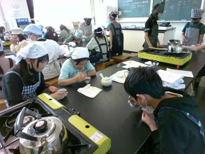 家庭科の学習で、お湯を沸かしてお茶を入れました。今日が初めての調理実習でしたが、安全に気を付けながらガスコンロを使ったり、手順を何度も確かめながらお茶を入れたりしました。