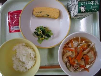 今日の献立は、ご飯、えごま入り卵焼き、おひたし、かやくうどん、しそかつおふりかけ、牛乳 です。