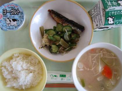 今日の献立は、ご飯、いわしの生姜味、茎わかめサラダ、ヨーグルト、牛乳 です。