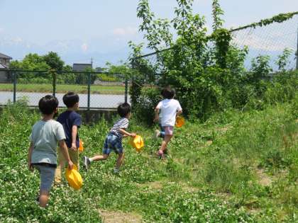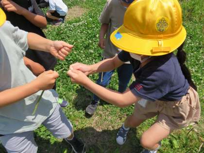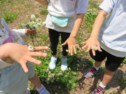 1年生:草花で遊ぼう 5月24日(火) 公開日 2022/05/24 更新日 2022/05/24 1年生の部屋 スキー山の周りにはシロツメクサがたくさん咲いていて、とてもいい香りがします。シロツメクサを帽子に付けたりアクセサリーを作ったりしました。オオバコで草相撲もしました。花の香りに誘われてとんできたモンシロチョウを捕まえようと、帽子を振り回しながら走り回るなどして、子供たちは思い思いの遊びを楽しんでいました。